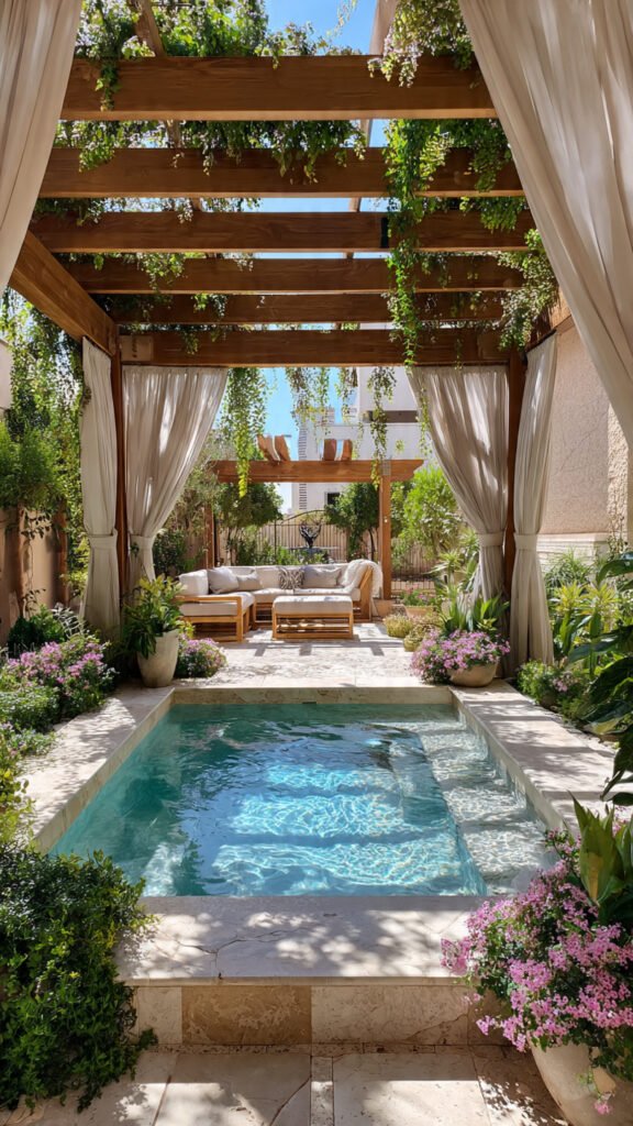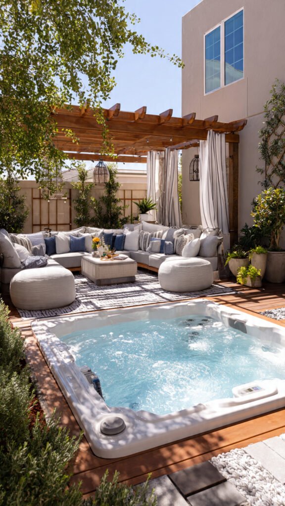 Adding a pergola or canopy creates structure and shade. I love how it frames the jacuzzi visually. The space feels intentional and upscale. It adds architectural interest. Doesn’t overhead structure make outdoor spaces feel complete? It elevates everything.