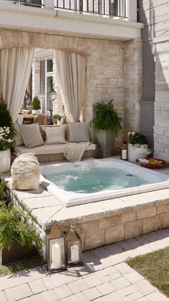Neutral tones around a jacuzzi feel calm and upscale. I love creams, stone, and soft grays for a serene look. The space feels cohesive. Nothing distracts from relaxation. Doesn’t restraint feel luxurious? Neutral palettes always age well.