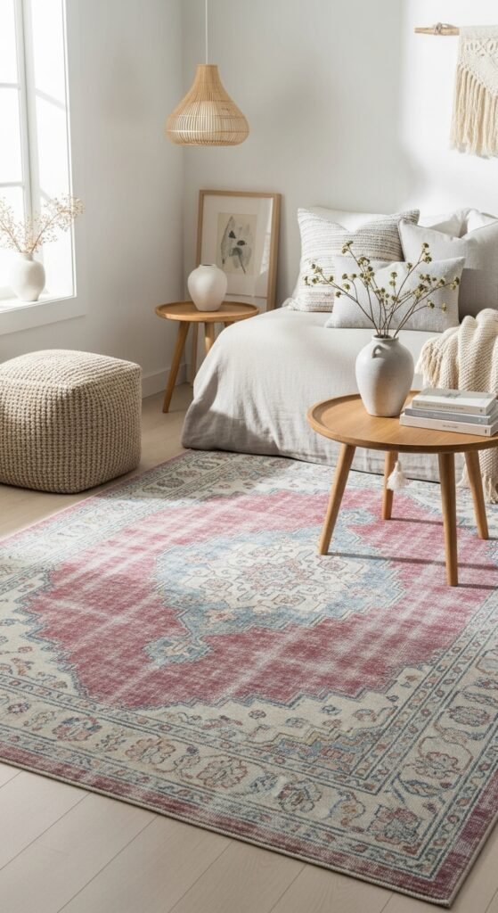 Faded or washed-out rugs feel calm and sophisticated. I love how they add color without intensity. The room stays serene. Nothing feels loud. Doesn’t softness always read as refined? This look works especially well in bedrooms and living rooms.