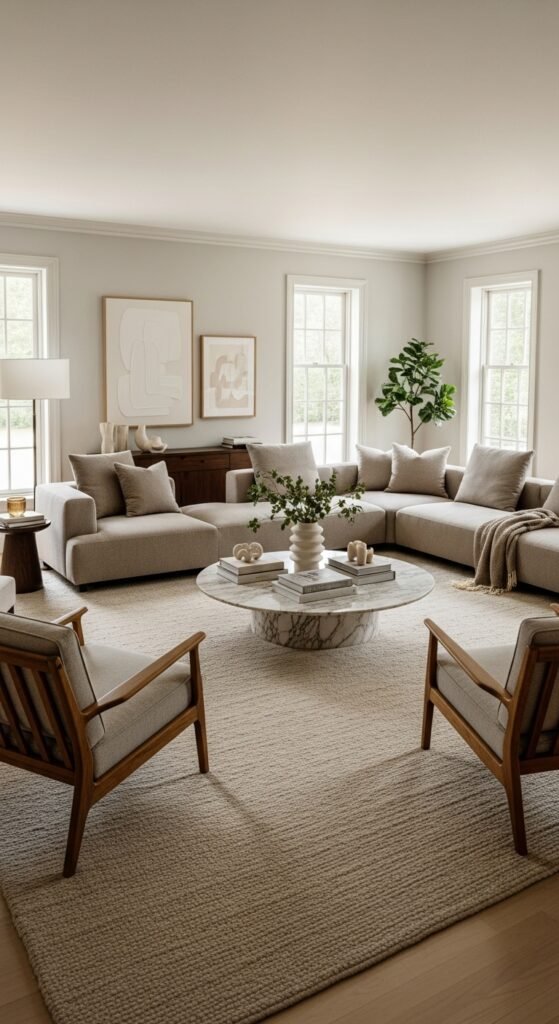 A rug that extends past furniture edges makes a room feel bigger and more intentional. I love how it visually expands the space. Small rugs can shrink rooms instantly. Scale really matters here. Doesn’t extra breathing room feel luxurious? Bigger almost always looks better.