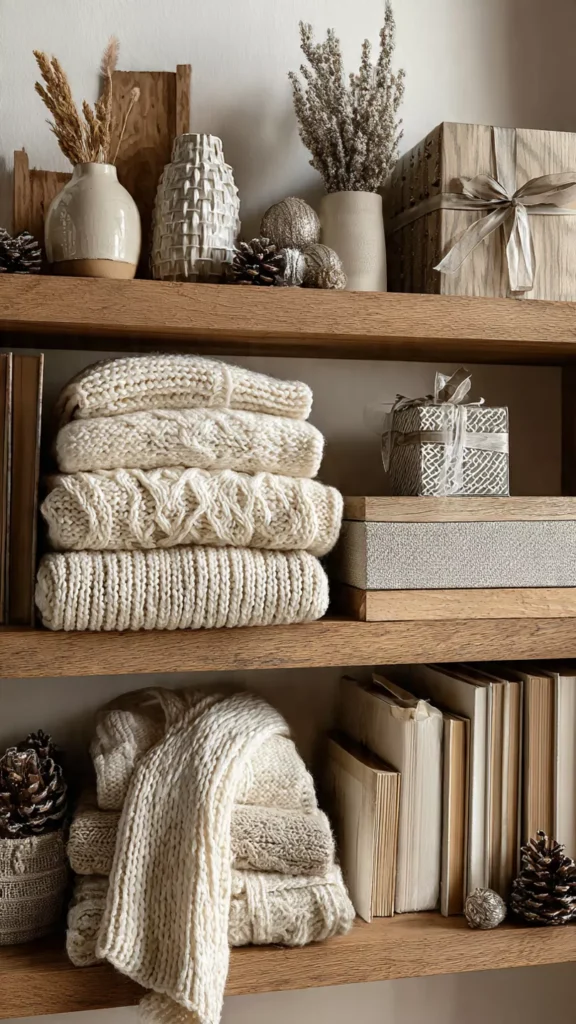Shelves often feel rigid, so adding soft knit stockings, folded scarves, or fabric-wrapped boxes brings balance and warmth. The texture contrast between wood, ceramic, and fabric makes everything feel more inviting. I like draping one small knit piece casually over the edge for that effortless, cozy look. Isn’t softness what makes winter décor feel comforting instead of cold? Pro Tip: Stick to neutral fabrics so textures shine without competing for attention.