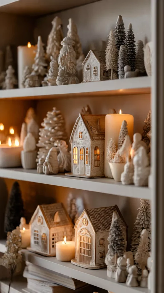 Ceramic winter décor adds charm through soft shapes and gentle color. Little houses, trees, or neutral holiday figurines feel cozy without shouting for attention. I like placing them near candles so their silhouettes glow softly at night. Isn’t it the quiet décor that often feels the most luxurious? Pro Tip: Keep figurines grouped in odd numbers for visual flow.