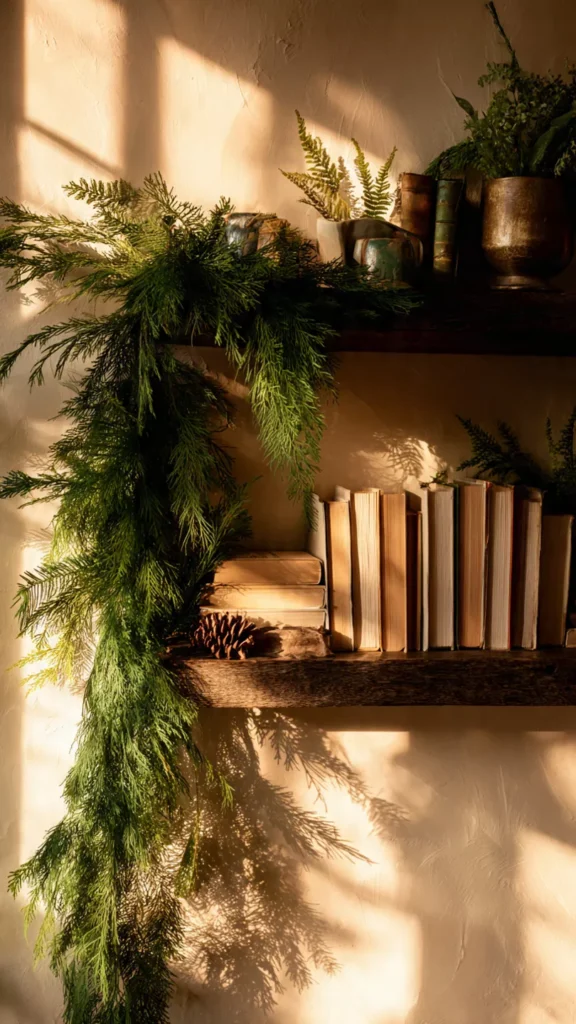 Draping soft evergreen garland across a shelf instantly adds depth, texture, and that unmistakable winter scent even when it’s faux. I love letting it cascade naturally over books and picture frames so it looks like it gently wandered there on its own. When the lights go down and the greenery casts soft shadows against the wall, the entire shelf feels like a forest vignette. Doesn’t greenery always make a space feel richer and more alive? Pro Tip: Use lightweight garland so it rests naturally without crushing your display.