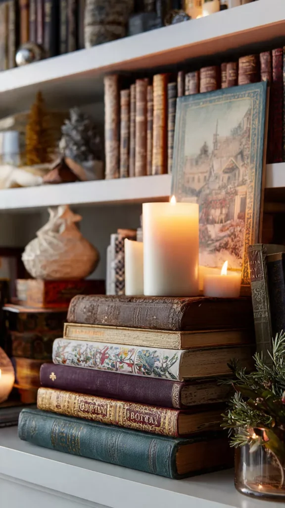 Books become beautiful styling tools during Christmas when you swap everyday stacks for seasonal cookbooks, winter poetry, or vintage holiday stories. Their covers add color, nostalgia, and meaning without adding clutter. I love turning one outward so the artwork becomes part of the design rather than hiding on the spine. Doesn’t a well-loved book instantly make a shelf feel lived-in? Pro Tip: Stack books horizontally to create platforms for candles and décor.