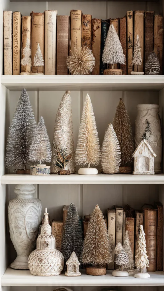 Mini Christmas trees tucked between books and décor pieces bring an instant sense of wonder to shelves without overpowering the space. I reach for bottle-brush trees in soft neutrals or metallic finishes when I want charm without clutter. They feel playful yet refined, like a quiet nod to nostalgia that never feels childish. Have you noticed how tiny trees carry just as much magic as tall ones? Pro Tip: Keep sizes varied to avoid a repetitive look.