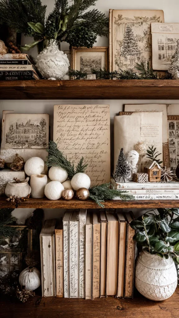 Nothing makes a shelf feel more heartfelt than personal holiday pieces that carry memories. Handwritten recipe cards, vintage ornaments, family photos from past Christmases—these tell a quiet story that no store-bought décor ever could. They transform shelves from styled displays into emotional touchpoints. Don’t personal items always make a space feel like home instead of a showroom? Pro Tip: Mix keepsakes with neutral décor to keep the shelf visually balanced.