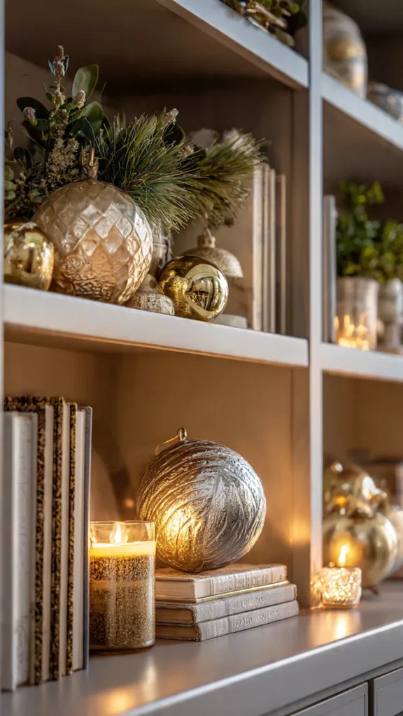 Metallics catch winter light in the most beautiful way, especially when layered among soft greenery and neutral décor. Gold, champagne, and brushed brass ornaments reflect candlelight in a way that makes shelves feel softly illuminated even during the day. I often tuck small metallic bells or spheres between books for subtle sparkle. Isn’t shimmer the unsung hero of cozy holiday styling? Pro Tip: Stick to one metallic tone for a more cohesive look.