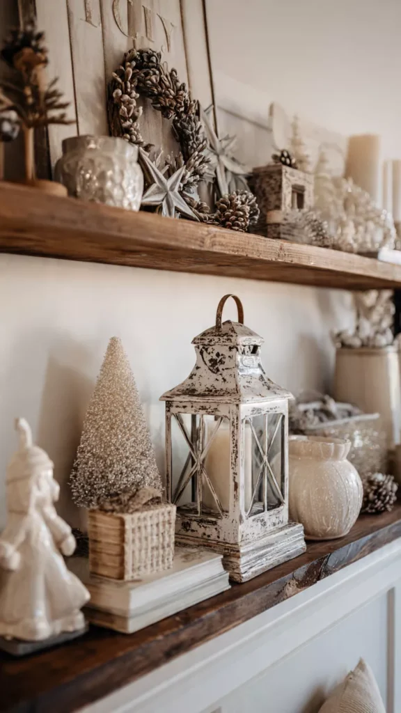 Every well-styled shelf needs a centerpiece that quietly commands attention. A vintage lantern, oversized holiday sign, or sculptural winter figurine can anchor the entire display. I always choose something with personal meaning so the shelf feels curated rather than staged. Isn’t the best décor the kind that tells a story? Pro Tip: Keep the focal piece slightly off-center for a more natural look.