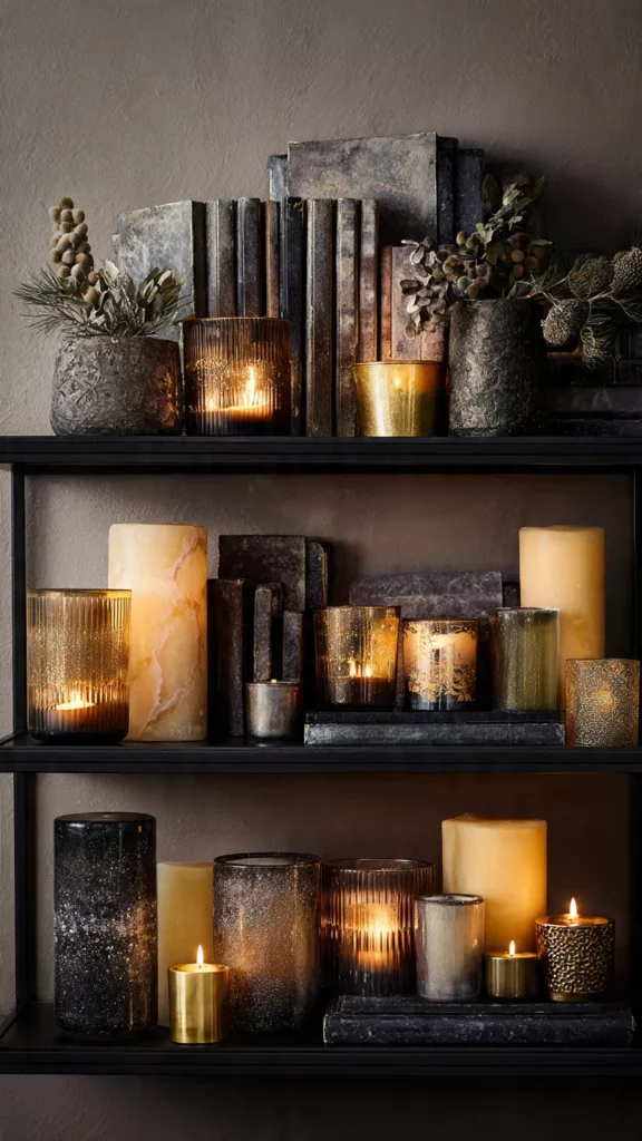 Nothing turns a shelf into a cozy focal point faster than a cluster of candles in mixed heights and finishes. The flicker of warm light bouncing off glass, ceramic, and brass creates a layered glow that feels incredibly intimate at night. I like grouping them in threes because it feels balanced without looking too staged. Isn’t it amazing how candlelight makes even the coldest evenings feel welcoming? Pro Tip: Use flameless candles on higher shelves for safety and continuous ambiance.