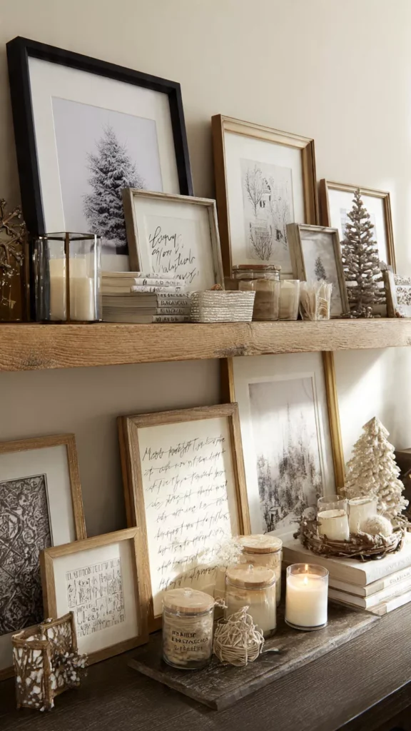 Christmas artwork on shelves adds instant personality and seasonal storytelling. Minimal winter landscapes, handwritten quotes, or soft vintage prints work beautifully layered behind smaller décor items. Frames bring structure to your arrangement and help anchor the shelf visually. Don’t framed pieces make everything around them feel more intentional? Pro Tip: Lean frames instead of hanging them for easy seasonal swapping.