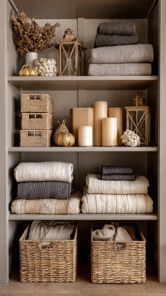 Shelves need storage just as much as beauty, and woven holiday baskets or fabric bins deliver both at once. They hide clutter while contributing texture and warmth to the display. I like using them to store extra candles, throw blankets, or small seasonal pieces. Doesn’t hidden storage always make a space feel calmer? Pro Tip: Choose baskets in neutral tones so they work year-round.