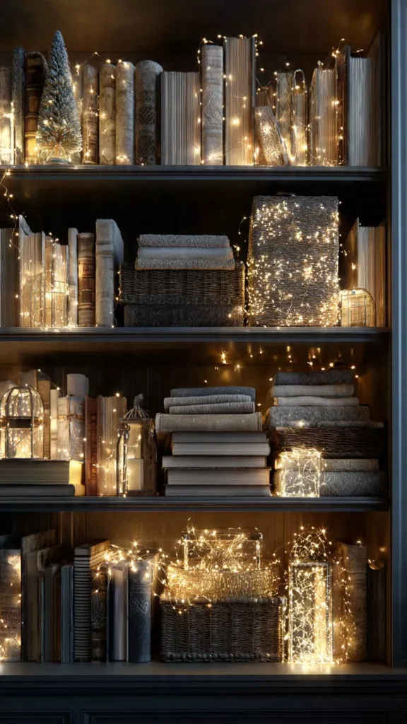 String lights woven through shelves create a magical atmosphere that feels gentle, dreamy, and incredibly inviting. I prefer warm white micro-lights because their glow looks like candlelight without the flame. At night, the shelves softly shimmer in the background like a quiet winter sky. Isn’t it wild how a little light can completely change a room’s mood? Pro Tip: Hide the battery pack behind books or baskets for a seamless look.