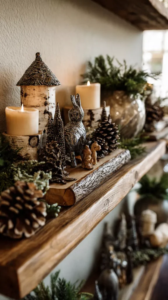 Natural materials ground holiday styling and keep shelves from feeling overly polished. I love scattering pinecones, birch accents, and small wooden figurines among candles and greenery for an organic balance. These raw textures soften glossy surfaces and add visual warmth. Isn’t there something comforting about bringing nature indoors during winter? Pro Tip: Spray pinecones lightly with clear sealant to prevent shedding.