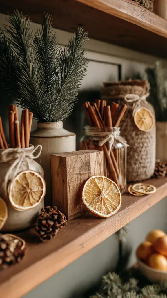 Scented décor on shelves quietly enhances the entire room without adding visual clutter. Cedar blocks, cinnamon sticks, dried orange slices, and pine sprigs release gentle fragrance that feels comforting rather than overpowering. It’s like decorating for the nose as well as the eyes. Isn’t scent the fastest way to trigger holiday memory? Pro Tip: Refresh natural scent elements every few weeks for lasting aroma.